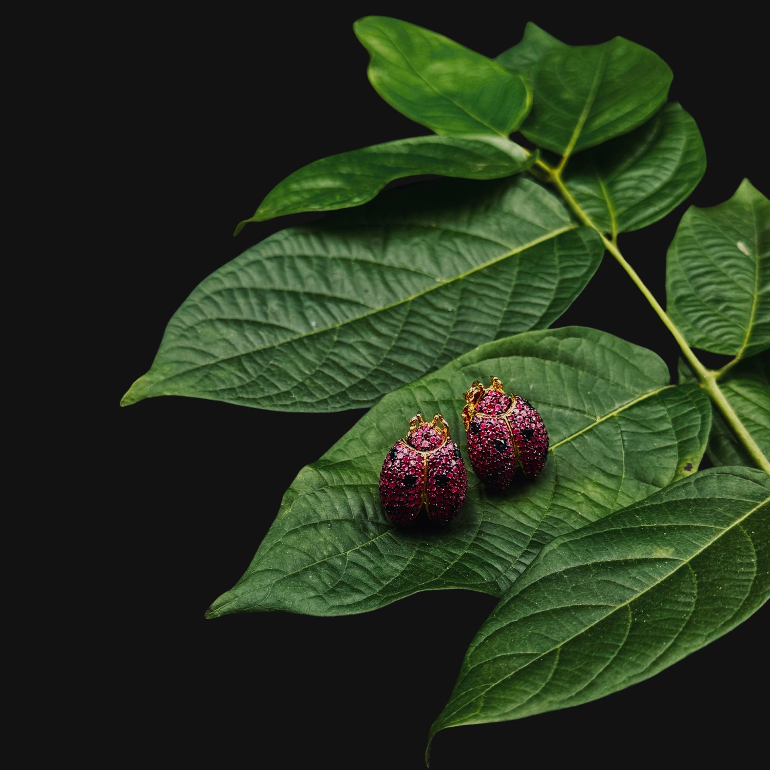 A lady bug themed earring handcrafted in silver, plated with gold set with Burmese Rubies, and Blue Sapphires.