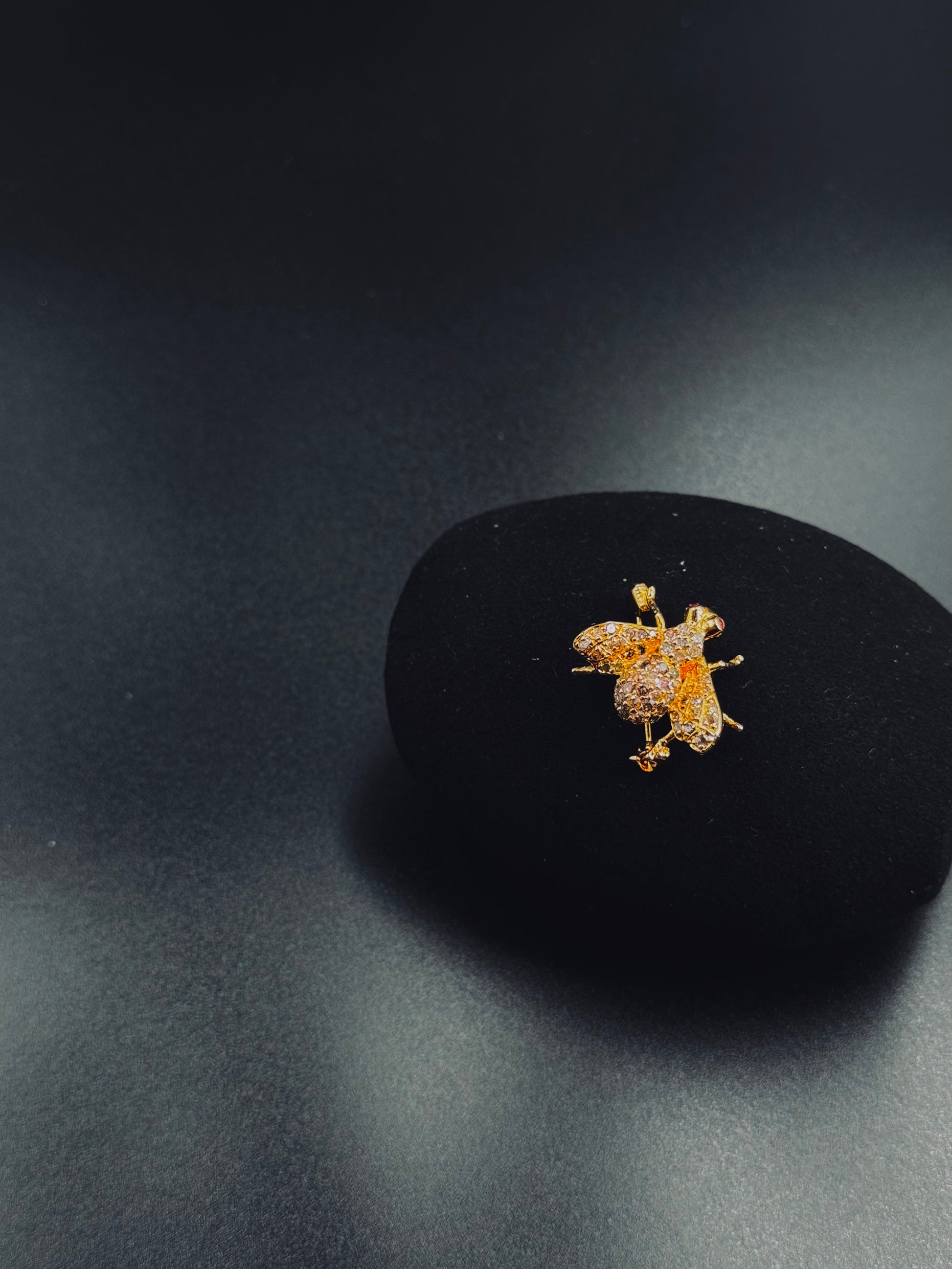 A bee-inspired brooch cum pendant in silver with gold plating, set with warm brown diamonds across its sculpted body and vivid Burmese rubies for the eyes — an elegant nod to nature’s quiet opulence.