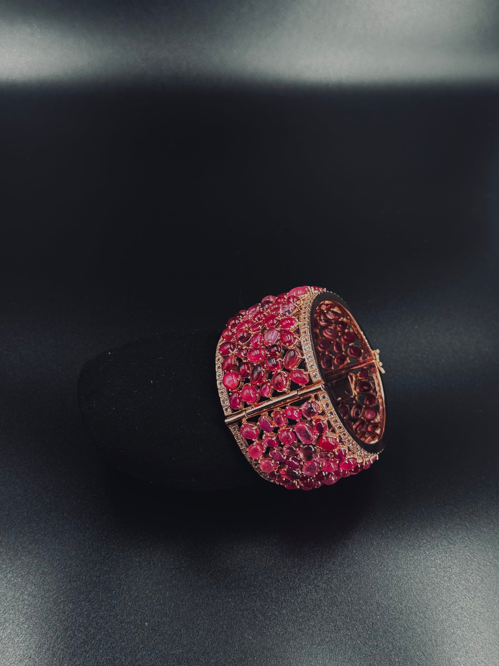 “GLORA’ is a cuff bracelet made in silver with rose gold polish, set with over 200 carats of handpicked cabochon Rubies and White Topazes.