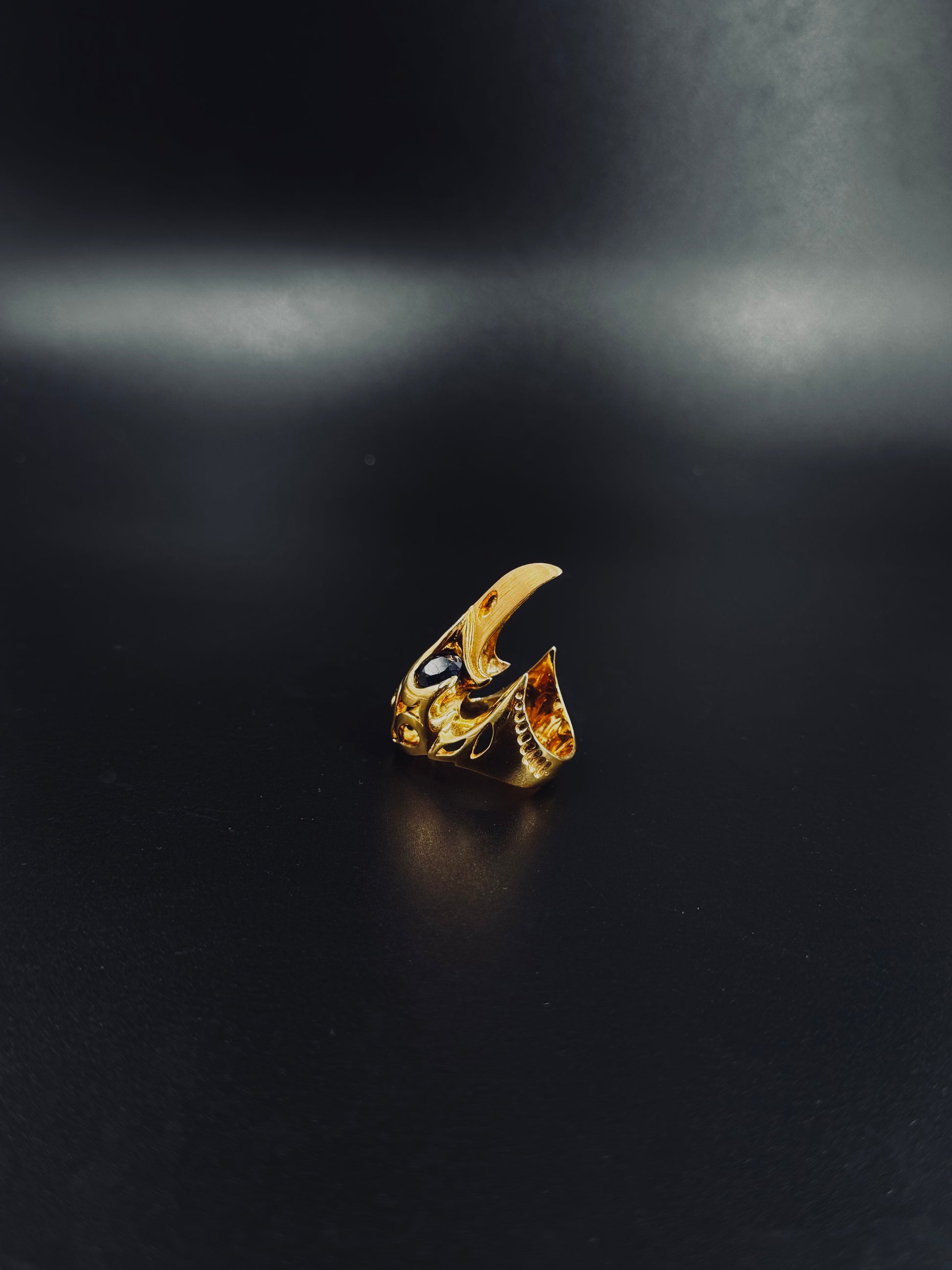 An eagle motif ring crafted in silver and plated with gold, set with striking blue sapphires for the eyes. A bold tribute to strength and vision, captured in a sculptural, wearable form.