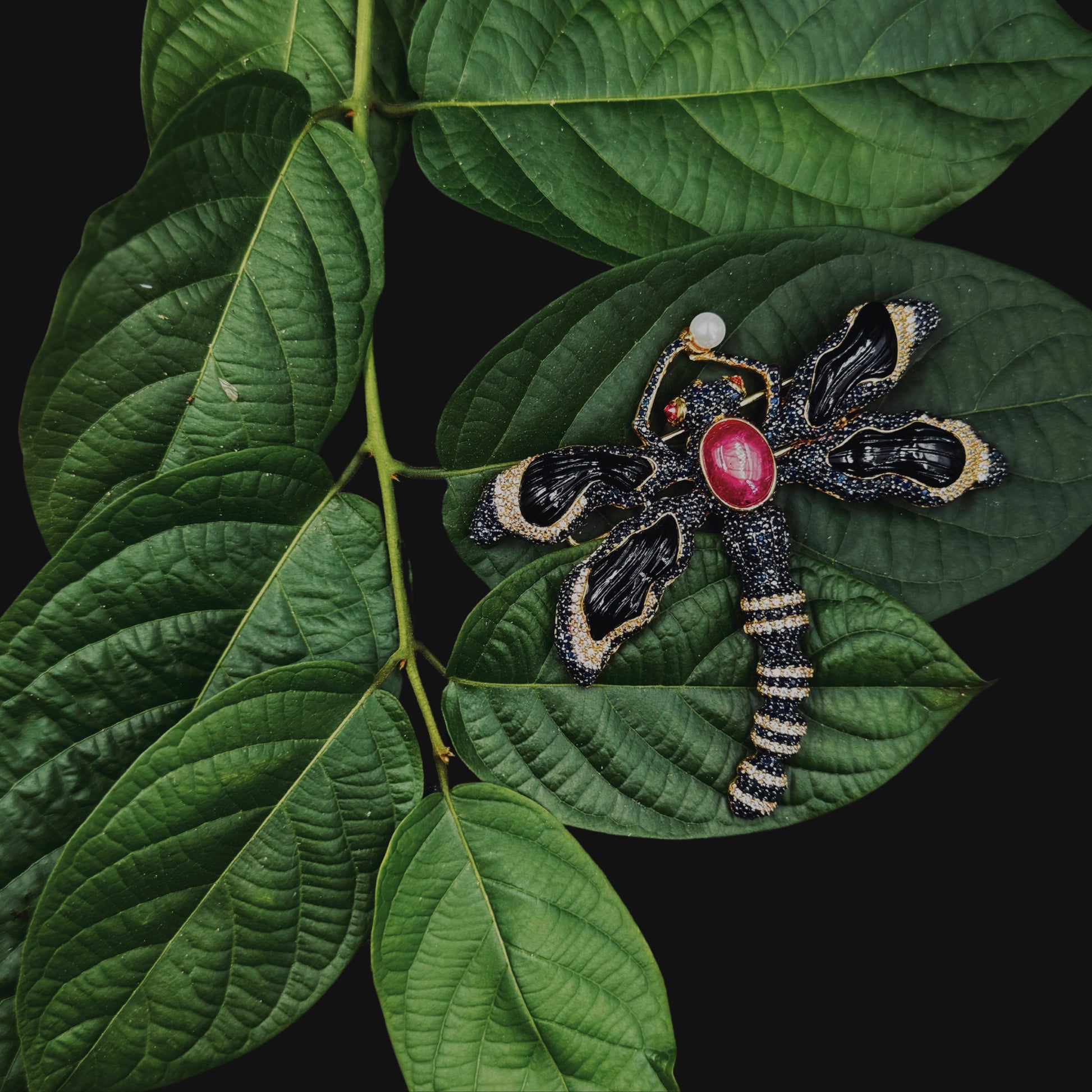 An one of one art nouveau brooch handcrafted in silver, plated with gold, set with Blue Sapphires, White Topaz, Freshwater Pearl, carved Black Onyx and Ruby.