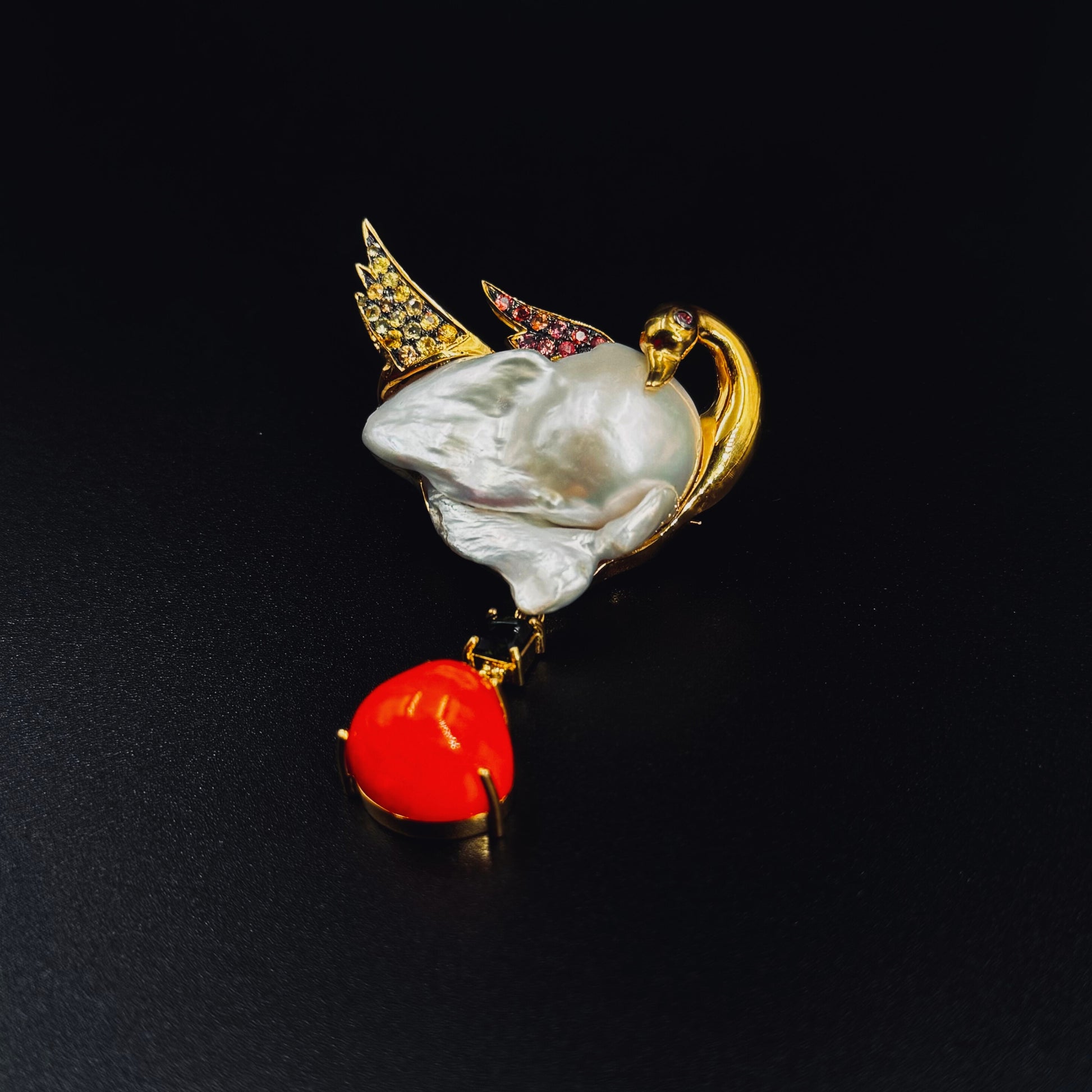 'PALOMA' is a gold-plated silver brooch-cum-pendant, inspired by the elegant form of a swan, encircles a natural baroque pearl. Orange and yellow sapphires define its wings, anchored by a vivid orange opal drop.